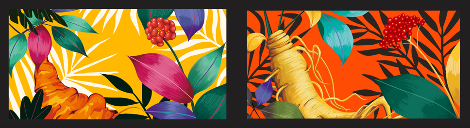 李華清項目團隊翻閱了各種文化書籍,從《聆聽漢畫》中找到了靈感,發現漢畫的風格大多都是浪漫渾樸,擴大豪放的風格,我們學習上面的繪制技巧和表現方法:畫面四周黑色邊框,猶如漢代歷史的大門,將我們帶入春天的百草園,去窺探神秘百草園的生長意境,感受撲面而來的自然芳香的本草氣息。