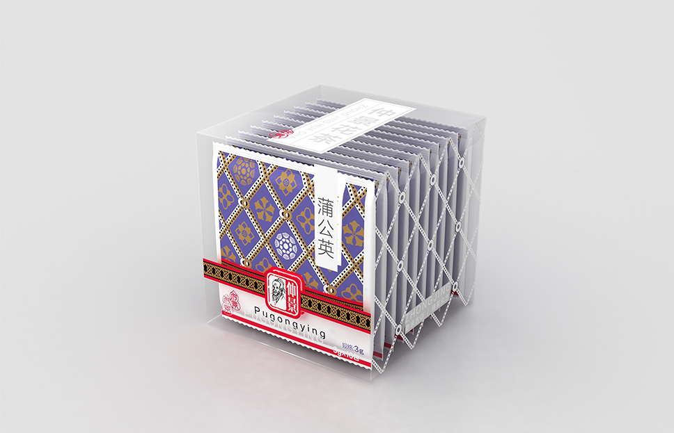 李華清項目團隊在市場走訪中看到了中醫抓方配伍的場景,由此產生了靈感的聯想。我們運用方勝紋與十字穿環紋結合衍生出抓方配伍場景凌霄花、茱萸花、柿蒂紋與產品進行搭配,實現君臣佐使,和諧配伍。通過簡單有序的元素排列,形成專屬的仲景花茶戰略元素。